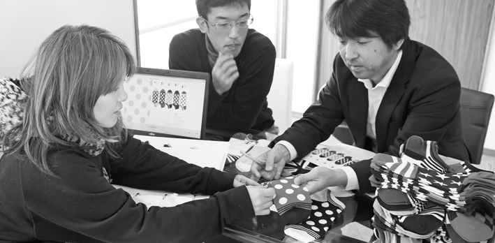 営業部では商品企画部を軸に、次のシーズンの流行をいち早く察知して、デザインや図柄、カラーを決めていきます。販売ルートに応じて求められる商品の特性が異なりますから、柔軟に企画内容を変えて対応しています。稲坂莫大小の商品は、昔からどんなデザインの靴下でも、素材や履き心地など品質を守ることに重点を置いています。特に履き心地は、自分で履いて確認をしています。多く見かける一般的な靴下は、安価で品質もデザインもそれなりというものが多いようです。しかし私たちは“少々値が高くても、満足のいく品質” だと評価されるものを作っていきたいと考えています。特に、これからは「これがメイドインジャパン」だと胸を張れる国内製にも、一層の力を入れていきたいと思っています。